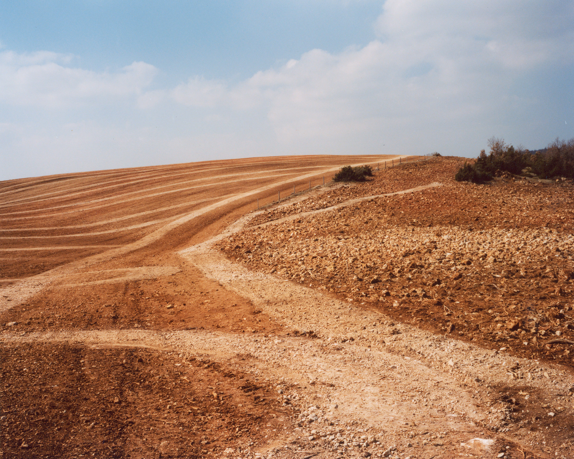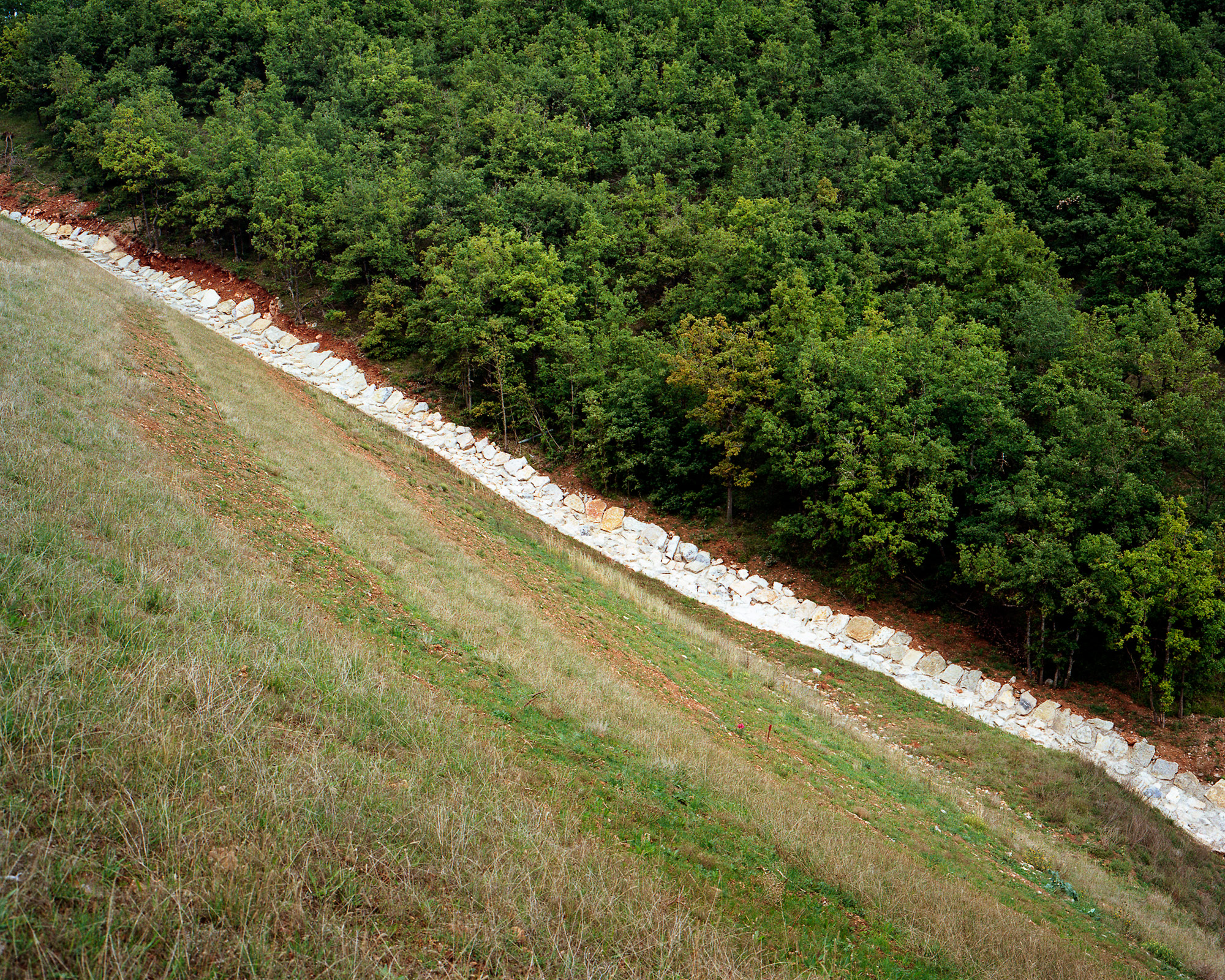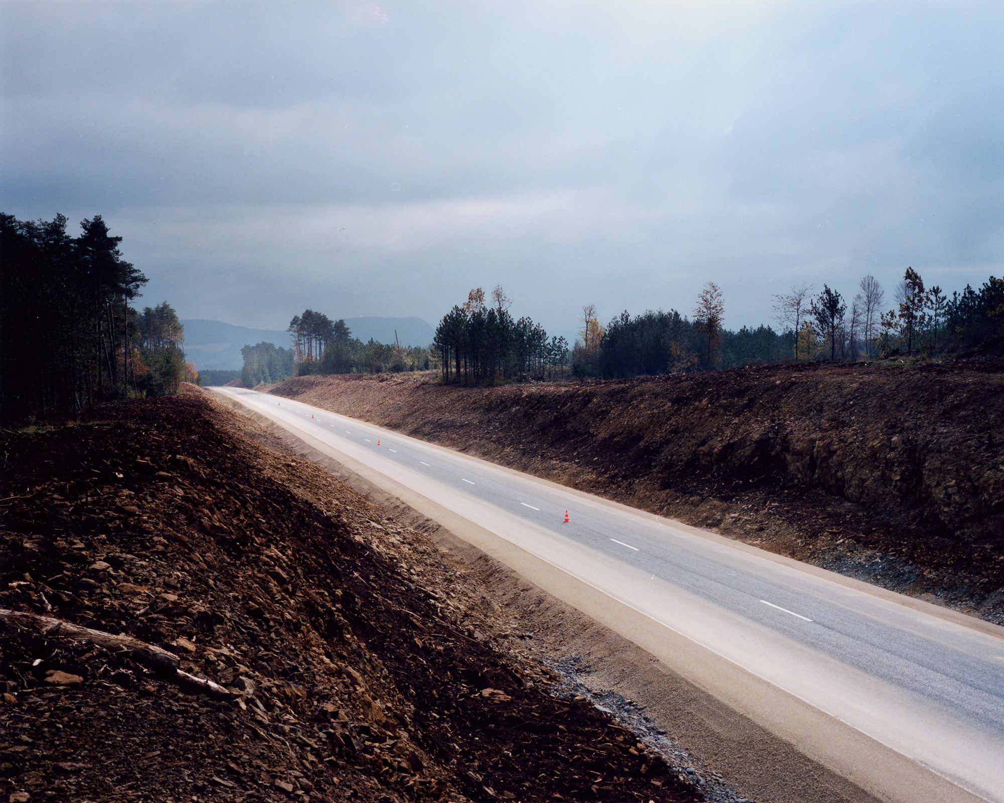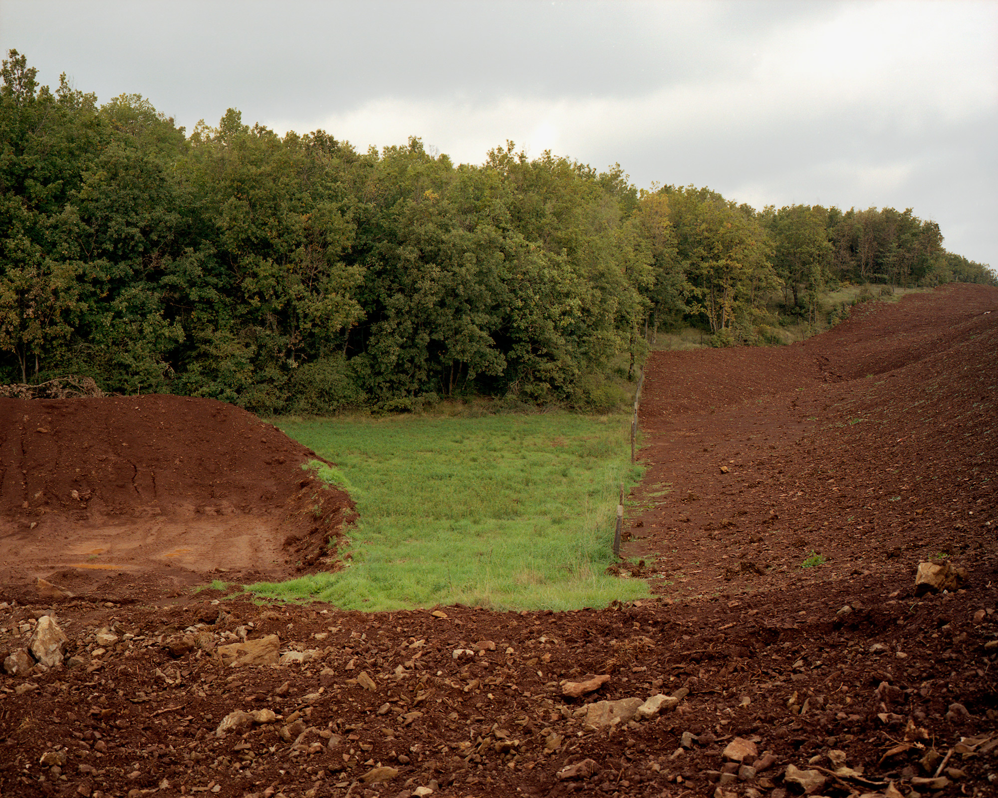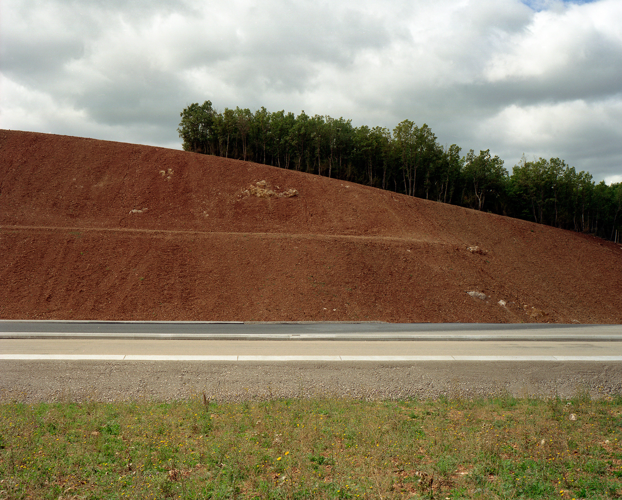 Nous montre-t-il de la photographie documentaire ? Au premier abord, cela semble possible. En effet, Geoffroy Mathieu montre la lente transformation d’un paysage sur une durée de trois ans. Il maîtrise les usages de la photographie documentaire et architecturale, en cours depuis une dizaine d’années : emploi de la couleur, utilisation d’un appareil moyen format, vision nette et frontale. Cependant, il réussit à jouer avec les codes de la photographie documentaire dans le but de nous faire appréhender le paysage sous un œil neuf, résolument contemporain. Les éléments très nets semblent disposés sur un même plan. Seule, la composition rigoureuse de l’image propose une hiérarchisation des éléments induite par le désir du photographe.